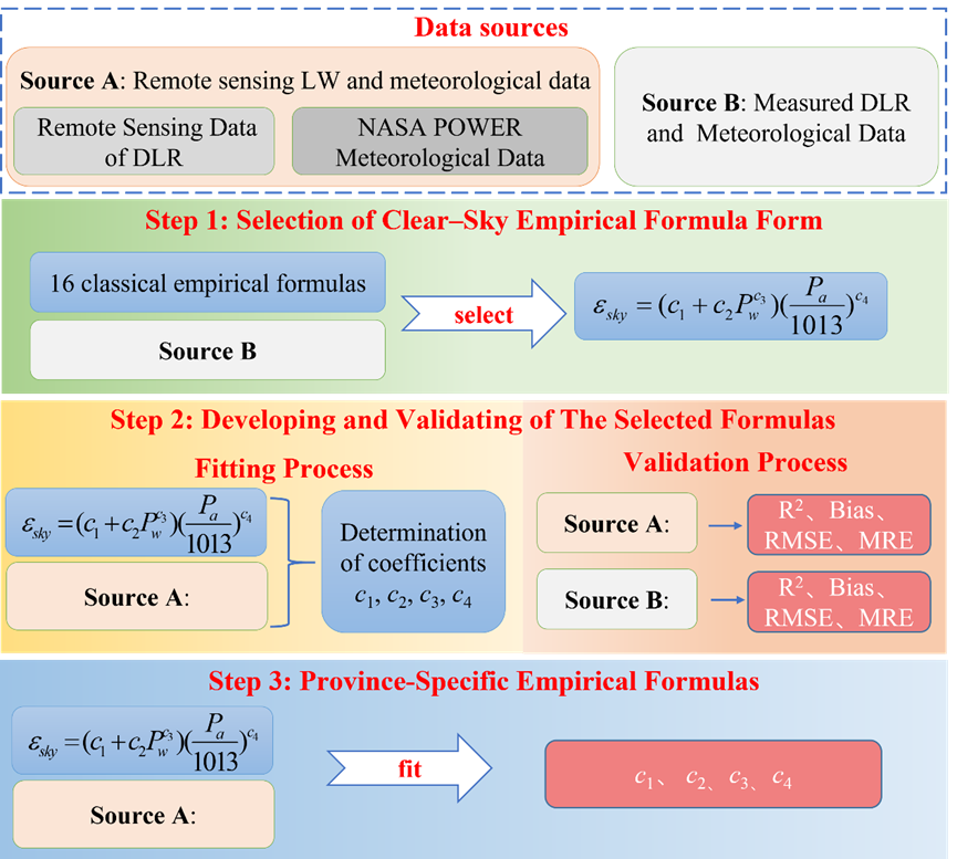 本文整合AVHRR卫星下行长波辐射与NASA POWER气象数据,提出遥感驱动的有效天空发射率反演与DLR估算流程。先用长白山实测数据对16种晴空经验模型最小二乘重标定并筛选最优形式(Dai–Fang),以R²、RMSE等指标评价。再以禹城为例用遥感DLR拟合系数,并分别用遥感与AsiaFlux实测DLR验证。最终推广至全国各省,建立省级晴空发射率经验式,并结合CMF与经典云修正模型实现全天空DLR参数化。
